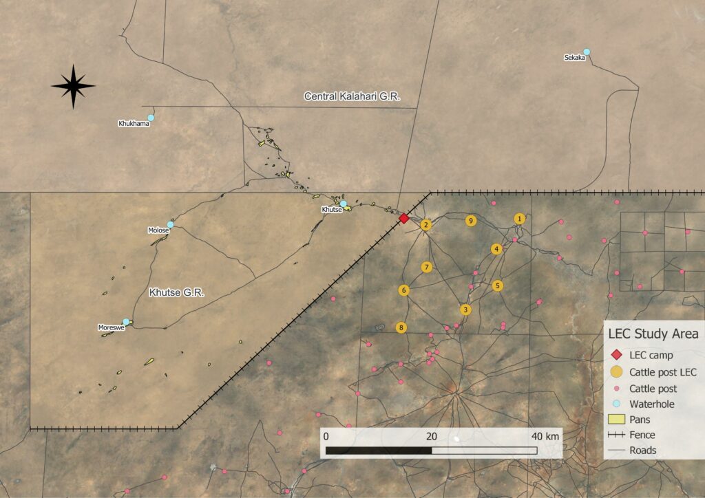 Unser Arbeitsgebiet liegt im Kweneng District, direkt angrenzend an das Khutse Game Reserve. Dort konzentriert sich LEC auf sieben Cattle Posts – Ditampane/Mosime, Kungwane, Mahuhumo, Makakamara, Mangadiele, Moilwane und Mokujwane – sowie auf das Dorf Kaudwane.